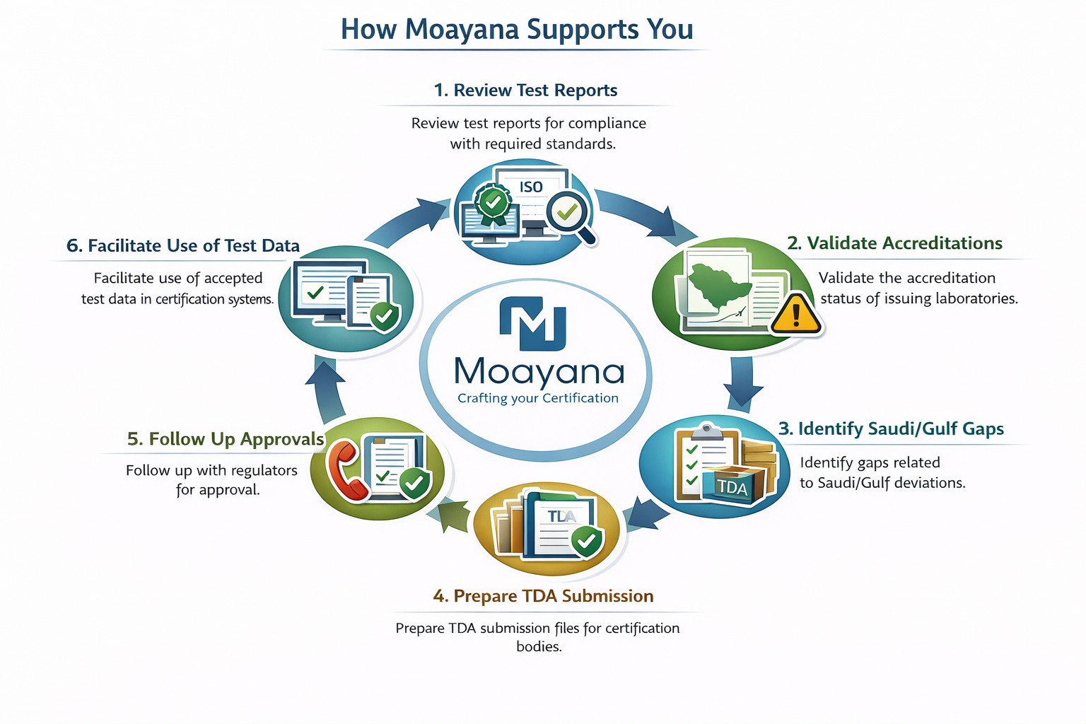 Test Data Acceptance (Satellite Testing) allows manufacturers to use test reports issued from accredited international laboratories and have them accepted by Gulf and international regulatory schemes. Moayana helps clients validate that their test reports meet SASO, GSO, SFDA, ESMA/MOIAT, and other authority requirements.